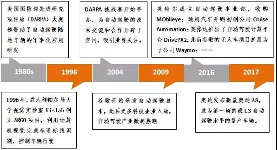 無人駕駛的概念早已有之。早在1925年,無線電設(shè)備公司Houdina Radio Control公司設(shè)計實現(xiàn)第一輛無人駕駛汽車American Wonder;1956年,通用公司公布世界上第一輛配備了汽車安全及自動導(dǎo)航系統(tǒng)的概念車Firebird II;20世紀(jì) 60、70年代,西方發(fā)達(dá)國家開展無人駕駛車輛研究應(yīng)用于軍亊領(lǐng)域;20世紀(jì)90年代開始,技術(shù)的突破帶動無人駕駛汽車的快速發(fā)展,激發(fā)了各國研究的熱情;2004年,美國國防部高級研究項目局(DARPA)舉辦了無人駕駛進(jìn)程中最重要的挑戰(zhàn)賽,三屆比賽對后來的技術(shù)發(fā)展產(chǎn)生了深進(jìn)的影響;2009年開始,Google為代表的各大公司陸續(xù)開始無人駕駛技術(shù)的研究,拉開了產(chǎn)業(yè)序幕。隨著技術(shù)產(chǎn)業(yè)鏈的日臻成熟,2016年被公認(rèn)是無人駕駛元年,目前業(yè)界也正在積極推動以市場為主導(dǎo)、企業(yè)為主體的產(chǎn)業(yè)化落地。