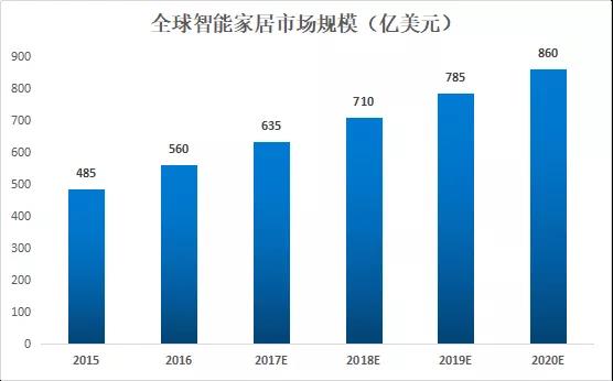 根據(jù)GFK統(tǒng)計,全球智能家居市場規(guī)模在2015年達(dá)485億美元,隨后增速逐漸趨緩,預(yù)計仍然維持每年約80億美元的增速。預(yù)計2018年市場規(guī)模將達(dá)到710億美元。