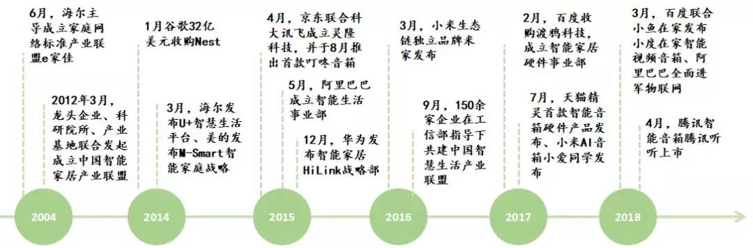 早期的中國智能家居市場受制于技術(shù)和市場環(huán)境,盡管有龍頭企業(yè)和科研院所等大力推動,但一直是不瘟不火。直到2014年谷歌以32億美元收購Nest的事件引爆全球的智能家居產(chǎn)業(yè),同年的美國CES上,三星和LG也推出了各自的智能家居平臺。在此背景下,智能家居的熱度席卷至國內(nèi)市場,除最早進(jìn)入的一批家電企業(yè)外,消費電子、互聯(lián)網(wǎng)公司以及運營商等產(chǎn)業(yè)鏈中的關(guān)聯(lián)方也紛紛進(jìn)場,或自研智能硬件,或布局生態(tài)平臺。不同類型企業(yè)間的跨界合作和開放生態(tài)成為智能家居市場的主流。亞馬遜Echo的成功讓國內(nèi)市場開始聚焦智能音箱這一入口級產(chǎn)品,2017年下半年開始的入口爭奪戰(zhàn)的背后,是巨頭公司對整個智能家居生態(tài)的野心。
