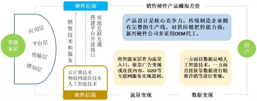 將智能家居劃分為硬件和軟件兩個層面,其中硬件對應(yīng)于智能家居的應(yīng)用層,軟件對于智能家居的平臺層、傳輸層和感知層。硬件產(chǎn)品的品牌方專注于產(chǎn)品側(cè)的設(shè)計和制造,向終端用戶提供的是智能家居的物理屬性,通過銷售硬件賺取差價實現(xiàn)盈利。針對智能家用產(chǎn)品的云計算、物聯(lián)網(wǎng)通信和人工智能三項核心技術(shù),技術(shù)供應(yīng)商通常會提供其中的一項或多項能力。他們既可以選擇直接通過向硬件廠商銷售技術(shù)和服務(wù)變現(xiàn),也可以選擇以硬件產(chǎn)品連接到海量的終端用戶,利用獲取到的用戶流量和數(shù)據(jù),通過面向消費者的互聯(lián)網(wǎng)服務(wù)和面向企業(yè)的數(shù)據(jù)服務(wù)進(jìn)行變現(xiàn)。