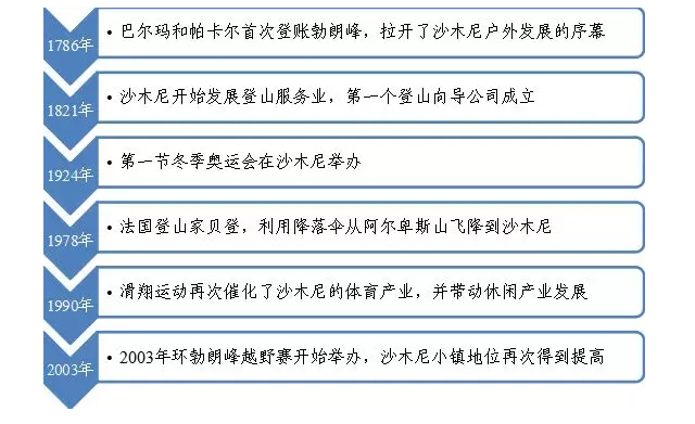 沙木尼的作為特色小鎮(zhèn)的最初起源,來自1786年8月當?shù)孬C人巴爾瑪和醫(yī)生帕卡爾兩人首次登上勃朗峰;1821年開始,沙木尼開始發(fā)展登山服務業(yè),小鎮(zhèn)內(nèi)34名的本地向?qū)ЫM成了一個向?qū)Ч荆?924年第一屆冬季奧運會在沙木尼舉辦,世界性的滑雪教練訓練中心也在這里落戶。至此,沙木尼的特色小鎮(zhèn)地位已經(jīng)基本