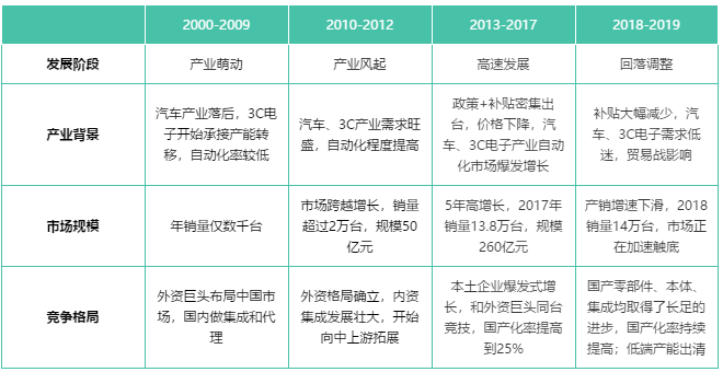 中國汽車產業(yè)制造水平相對落后,3C電子開始承接第三次全球產能轉移(日韓臺到中國),自動化程度較低。外資機器人巨頭普遍2000年前后進入中國,工業(yè)機器人年銷售數千臺,基本都是外資品牌,主要用于汽車行業(yè)。國內企業(yè)以做外資的系統(tǒng)集成和代理商為主,極少數企業(yè)如沈陽新松有自研機器人本體。