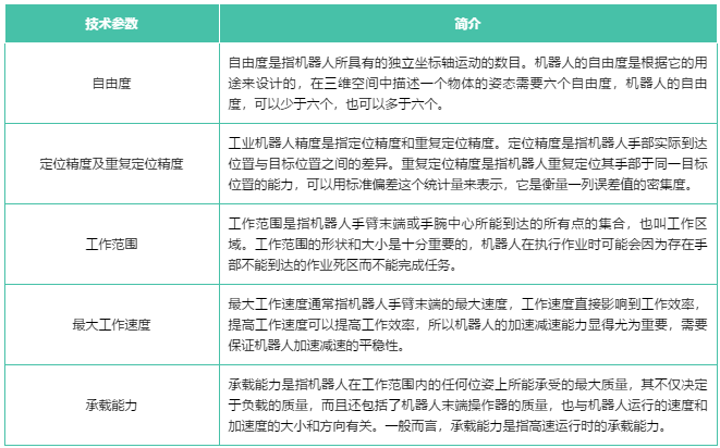 工業(yè)機器人的主要技術參數一般有自由度、定位精度及重復定位精度、工作范圍、最大工作速度和承載能力等。這些參數是工業(yè)機器人本體制造過程中重要的考量指標,是衡量一家廠商本體制造水平高低的標準。