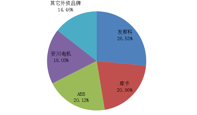 2017年,四大家族在中國工業(yè)機器人市場上的市場份額高達57.4%,發(fā)那科占比最高,達17.8%,其次為庫卡14.0%,ABB13.5%,安川電機12.1%,而其他外資品牌僅占9.7%。2017年四大家族在中國的市占率進一步加大,國產機器人品牌面臨較大壓力。
