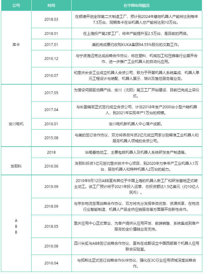 近年來,四大家族不斷加大在中國的業(yè)務布局,持續(xù)擴張產能并且將發(fā)展重點瞄準了中國市場。一方面,是出于高端行業(yè)的未來發(fā)展前景較好,四大家族對機器人行業(yè)景氣度的信心充足。另一方面,中國作為全球機器人最大需求市場,其地位日益重要,未來成長空間較大。