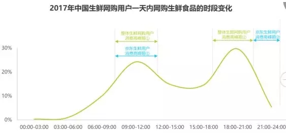 從消費時間來看,生鮮網(wǎng)購用戶購物的活躍曲線在09:00-12:00和18:00-21:00出現(xiàn)波峰,這兩個時間段分別對應(yīng)午餐前和晚餐前的使用時段,用戶可能選擇這兩個時間段網(wǎng)購午餐和晚餐所需要的食材。京東生鮮用戶消費的第一段高峰期和整體用戶基本一致,第二段高峰期時間為晚間21:00-22:00,相對靠后。艾瑞分析認(rèn)為,京東生鮮B2C模式目前主要為次日達,用戶在平臺購買即時性晚餐食材的需求較小。
