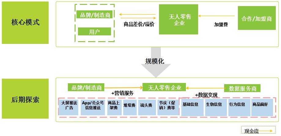 無(wú)人零售企業(yè)收入來(lái)源以銷(xiāo)售商品賺取差價(jià)為主,并且通過(guò)規(guī)模化提高議價(jià)能力降低采購(gòu)成本。此外,從加盟商獲取加盟費(fèi)用的商業(yè)模式也已經(jīng)開(kāi)始推行。無(wú)人零售發(fā)展至中后期,企業(yè)數(shù)據(jù)更為龐大,其盈利模式將隨之產(chǎn)生更多的想象空間,以互聯(lián)網(wǎng)思路開(kāi)展?fàn)I銷(xiāo)服務(wù)、數(shù)據(jù)變現(xiàn)等都是比較成熟的可參考模式。