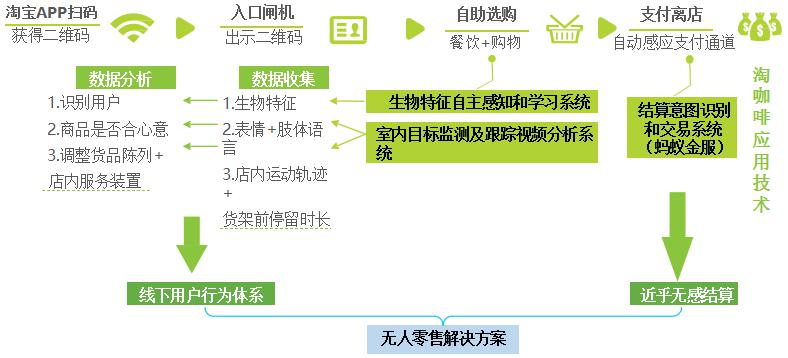 2017年7月阿里巴巴在淘寶造物節(jié)上推出無(wú)人便利店淘咖啡。淘咖啡經(jīng)營(yíng)面積約200平米,分成超市區(qū)(無(wú)店員)和餐飲點(diǎn)單區(qū)(有少量店員),可一次性容納客流50人左右。消費(fèi)者通過(guò)手機(jī)淘寶 APP 掃碼進(jìn)店,選購(gòu)?fù)瓿珊笮柰ㄟ^(guò)兩道結(jié)算門(mén),當(dāng)?shù)谝坏篱T(mén)感應(yīng)到消費(fèi)者的離店需求時(shí)即會(huì)開(kāi)啟,消費(fèi)者走出第一道門(mén)后,系統(tǒng)會(huì)自動(dòng)對(duì)所購(gòu)買(mǎi)商品進(jìn)行識(shí)別與結(jié)算,結(jié)算完成后第二道門(mén)自動(dòng)打開(kāi),消費(fèi)者離店。
