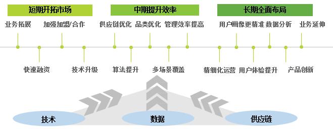 中期:企業(yè)的運(yùn)營(yíng)重點(diǎn)在于供應(yīng)鏈與管理效率的提升,包括企業(yè)進(jìn)行技術(shù)算法提升,并將供應(yīng)鏈進(jìn)行網(wǎng)狀轉(zhuǎn)變,同時(shí)擴(kuò)充或開(kāi)發(fā)零售多場(chǎng)景,覆蓋主要消費(fèi)場(chǎng)景,品類(lèi)、商品組合進(jìn)入精選模式,根據(jù)不同用戶個(gè)性化/精準(zhǔn)化推送等。