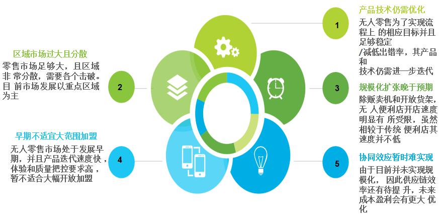 無(wú)人零售市場(chǎng)整體看好,但發(fā)展仍受到一定困阻典型優(yōu)質(zhì)企業(yè)能夠起到很好的示范作用,整體無(wú)人零售市場(chǎng)有發(fā)展前景。但目前來(lái)看,不容忽視的是市場(chǎng)剛剛經(jīng)歷一年左右的發(fā)展,還處于前期探索階段,因此還存在一些比較共性的發(fā)展困阻,主要集中在產(chǎn)品技術(shù)優(yōu)化、區(qū)域市場(chǎng)拓展、企業(yè)規(guī)模化發(fā)展、企業(yè)開(kāi)放加盟和供應(yīng)鏈的協(xié)同效應(yīng)。