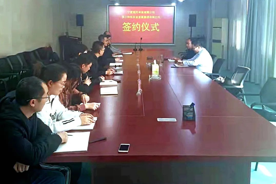 為進一步強化國企合作,增強業(yè)務(wù)拓展、優(yōu)勢互補,切實提高合作質(zhì)效,匯聚推進合力,近日,寧夏現(xiàn)代農(nóng)業(yè)有限公司(以下簡稱“現(xiàn)代農(nóng)業(yè)公司”)與銀川創(chuàng)投農(nóng)業(yè)發(fā)展集團有限公司(以下簡稱“創(chuàng)投集團”)舉行了合作協(xié)議簽約儀式。寧夏現(xiàn)代農(nóng)業(yè)有限公司總經(jīng)理張亞東,銀川創(chuàng)投農(nóng)業(yè)發(fā)展集團有限公司總經(jīng)理盛軍出席本次簽約儀式。
