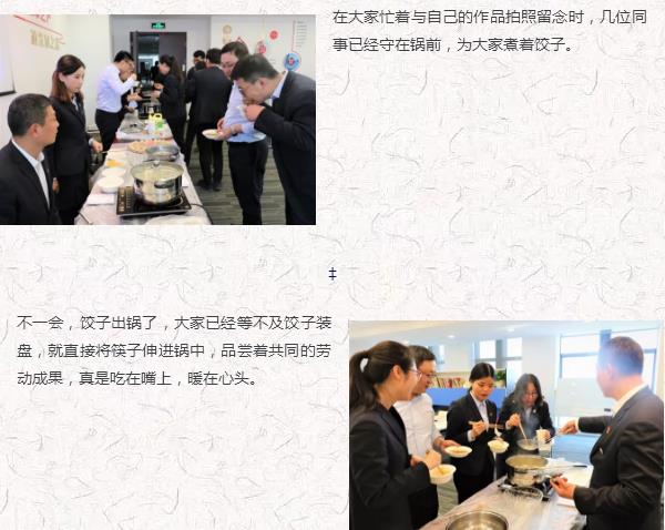 大家分成“愛吃餃子”“會做餃子”“多彩生活”和“幸福花兒”四個(gè)組合,展開了包餃子比賽。只見他們熟練的搟面皮、放餡料、捏餃子,十指翻飛之間,剁餡聲、歡笑聲、音樂聲,交織在一起,每個(gè)人臉上都洋溢著燦爛的笑容,公司里充滿了歡聲笑語,匯聚成了一片歡樂的海洋。